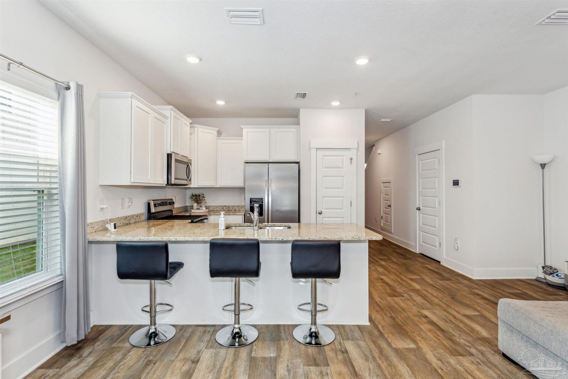 Welcome to this charming corner townhome in the heart of Pensacola! This bright corner-unit townhouse offers 3 bedrooms, 2.5 bathrooms, and a 1-car garage, seamlessly blending modern amenities with serene natural surroundings. Spanning 1,440 sq ft, the open floor plan is an entertainer's delight with a kitchen that features white cabinetry, light granite countertops, stainless steel appliances, a pantry, and a large breakfast bar. It flows easily into the expansive living and dining areas, with wood-look luxury vinyl plank flooring and ceiling fan, creating a warm and inviting atmosphere. A powder room on the main floor adds convenience for guests. Step outside to your back patio, where tranquil wooded views provide a peaceful backdrop. The area can be easily fenced, offering additional privacy and a perfect space for outdoor relaxation or entertaining. Upstairs is a generous Primary Suite featuring a large walk-in closet and ceiling fan. The adjoining en-suite bathroom has a walk-in shower, dual sinks with granite countertops, and a handy linen closet. Two additional spacious bedrooms with ample closet space and ceiling fans share a well-appointed second bathroom with a bathtub/shower combo. The conveniently located upstairs laundry room comes complete with a washer and dryer that convey with the property. Additional features include 2-inch wood-like blinds on all windows, fabric hurricane protection for all openings, and a Smart Home Connect system featuring keyless entry, enhancing both security and convenience. Residents of Admiral's Quarter enjoy access to a large community pool, perfect for unwinding on warm days. The prime central location offers close proximity to shopping, dining, medical facilities, Naval Air Station Pensacola, Navy Federal Credit Union, Baptist Medical Park, and the University of West Florida, making commutes and daily errands a breeze.